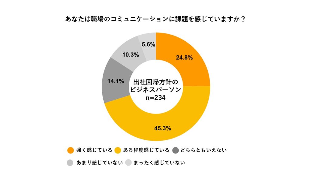 職場での出社回帰の流れで、対面での業務が戻りつつある中で、出社回帰傾向の職場の方に向けて「あなたは職場のコミュニケーションに課題を感じていますか?」という質問をしたところ、「強く感じている(24.8%)」「ある程度感じている(45.3%)」を合わせ70.1%がコミュニケーションへの課題を感じていることが分かりました。