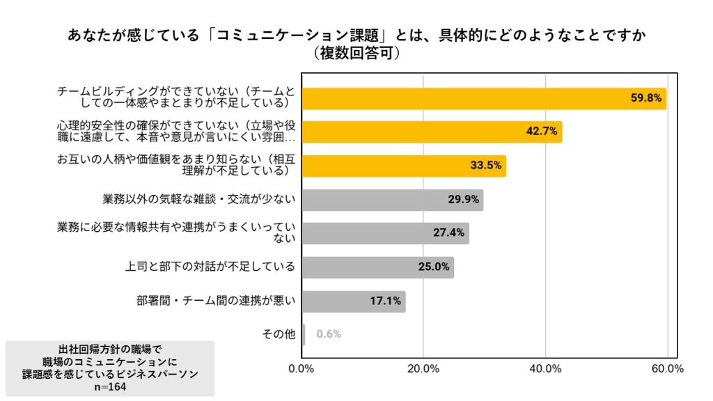 職場でのコミュニケーション課題を感じている方に具体的なコミュニケーション課題を聞いたところ(複数回答)、1位「チームビルディングができていない(チームとしての一体感やまとまりが不足している)」(59.8%)、2位「心理的安全性の確保ができていない(立場や役職に遠慮して、本音や意見が言いにくい雰囲気がある)」(42.7%)、3位「お互いの人柄や価値観をあまり知らない(相互理解が不足している)」(33.5%)となりました。