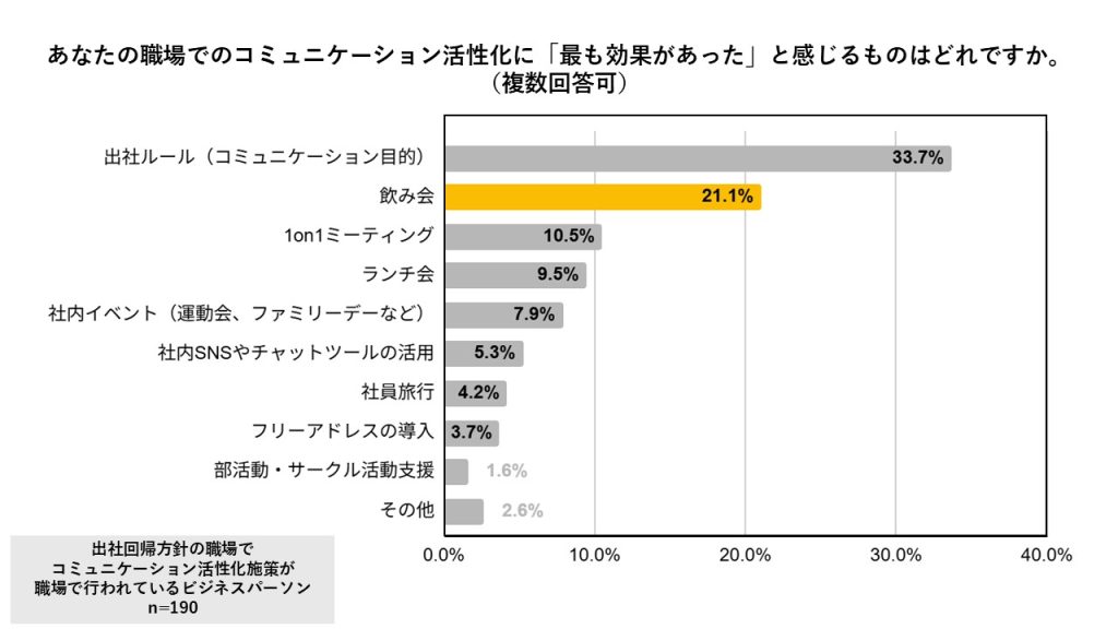 「あなたの職場でのコミュニケーション活性化に「最も効果があった」と感じるものはどれですか。」という質問(複数回答)を社内でのコミュニケーション活性化施策を行っている人に聞いたところ、「出社ルール(コミュニケーション目的)」(33.7%)に次いで、「飲み会」が21.1%と上位となりました。