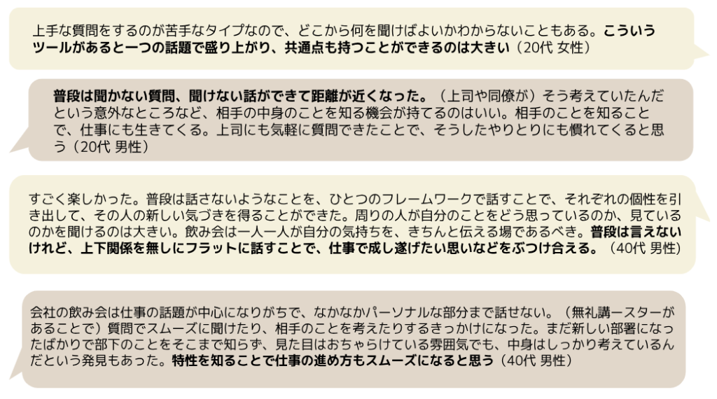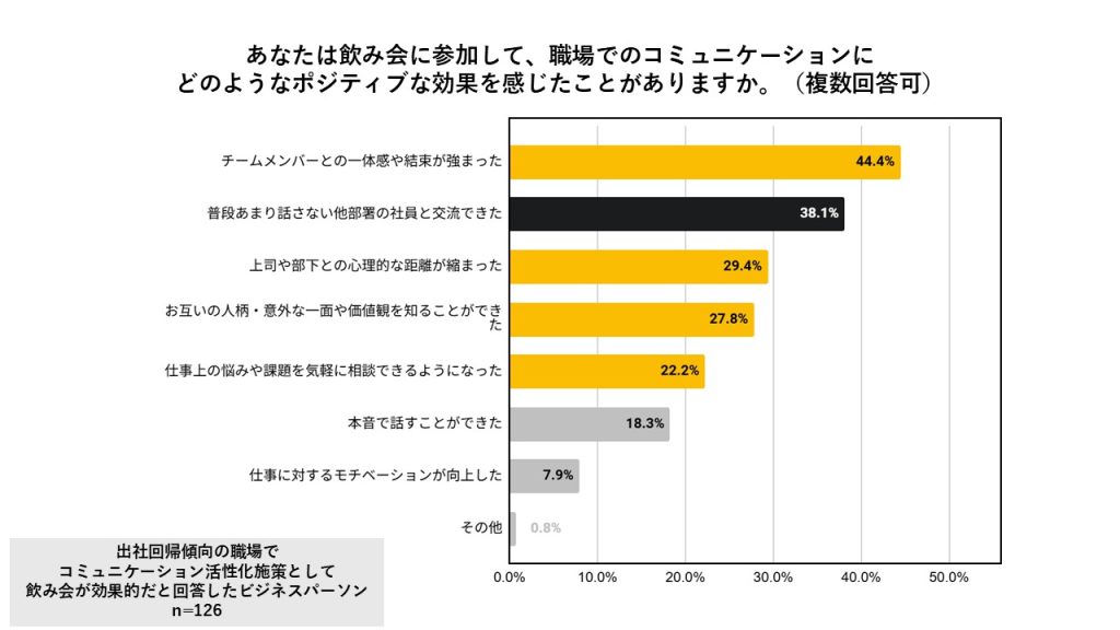飲み会のポジティブな効果として「チームメンバーとの一体感や結束が強まった(44.4%)」「普段あまり話さない他部署の社員と交流できた(38.1%)」「上司や部下との心理的な距離が縮まった(22.2%)」が上位に挙がりました。 また、「飲み会がきっかけで仕事が円滑に進んだエピソード」として、「フランクな雰囲気で上司と会話でき、仕事でも気軽に相談出来るようになった。」「人となりが分かるようになったので、仕事が進めやすくなった。」といった、飲み会の気軽な雰囲気の中での相互理解が進んだという声が多数寄せられました。
