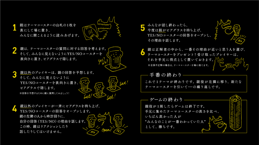 | 内容物 | ・YES/NOコースター [5色×各1枚] ・テーマコースター [40枚] ・遊び方説明書 [1部] |