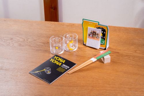 「松セット」限定でオリジナルグッズを同梱します。今年は「ペアグラス」「ビアログノート*」「ヤマチクオリジナルペア竹箸」の3種類を用意しました。一年の始まりにお箸も新調することで、新しい気持ちで食卓を楽しんでほしいという思いで、竹の箸だけをつくる箸メーカー「ヤマチク」(熊本県)のオリジナル箸を同梱しています。