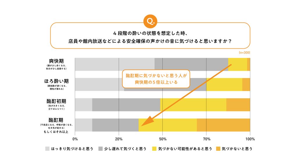 酔っているお客様に対する安全確保の声かけについて難しいと感じる点を聞くと、1位に「指示に従わない・動かない」「指示が理解されない・伝わらない」、3位に「適切な声かけ・避難誘導がわからない」という結果になりました。飲酒者に理解され、行動につながる具体的な声かけの方法が求められていると考えられます。