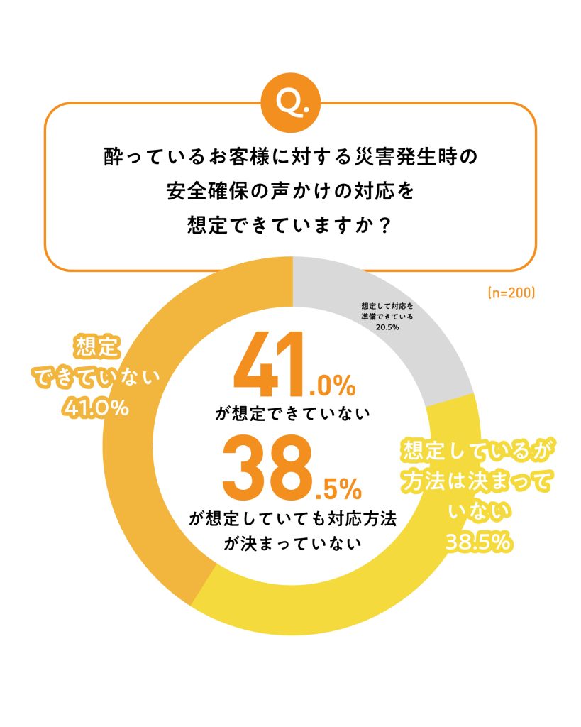 また、酔っているお客様に対する災害発生時の安全確保の声かけの対応を想定できているか聞いたところ、41.0%が想定できていない、38.5%が想定していても対応方法が決まっていない、と回答しました。声かけ相手が酔っているという特殊な状態を想定した対応が進んでいないことが伺えます。